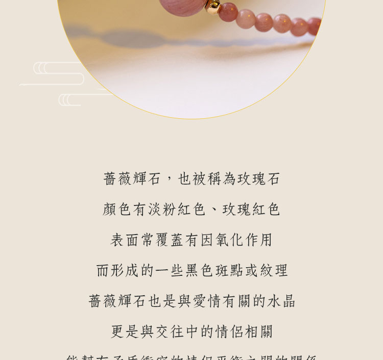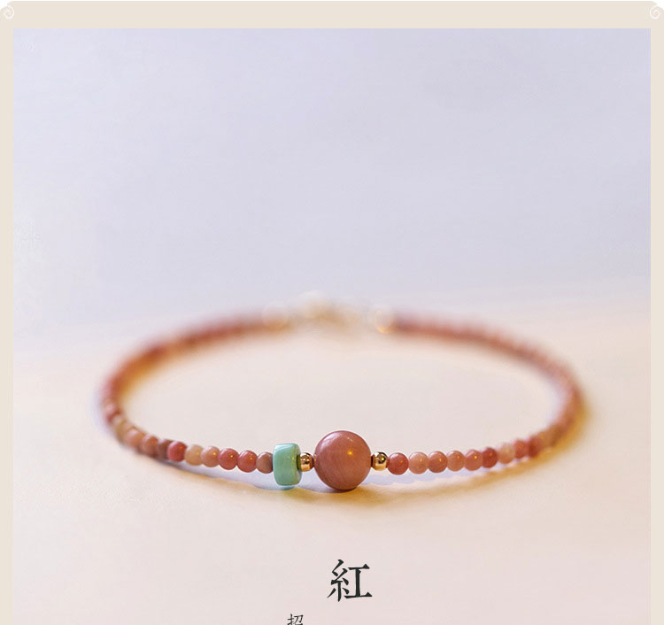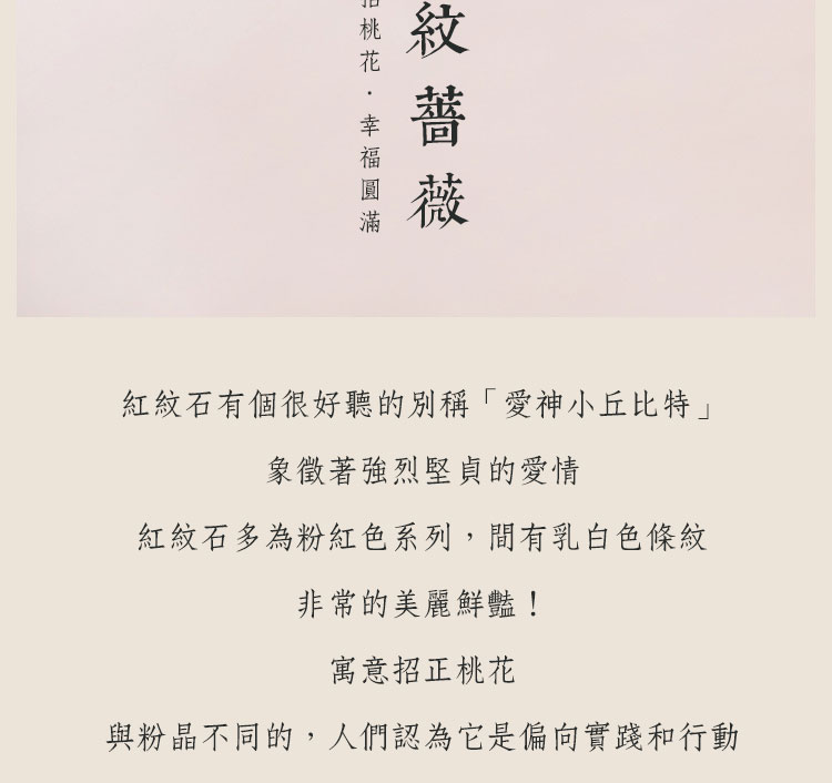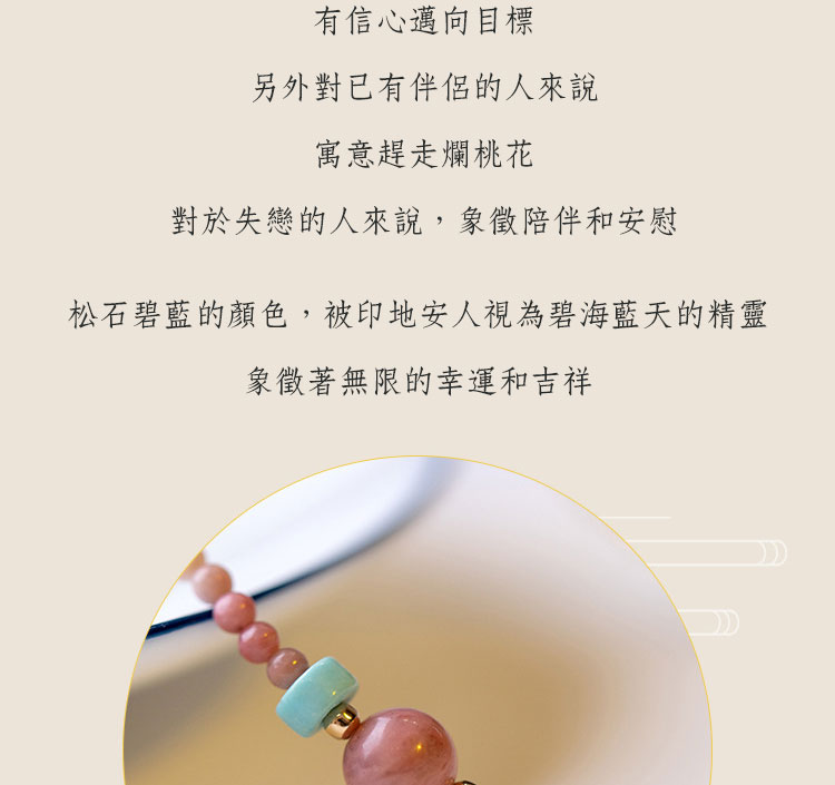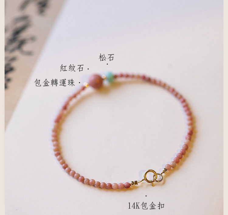 紅紋薔薇 – 材質:薔薇輝石 / 紅紋石 / 松石 / 14K包金珠 尺寸:手鍊14+4cm / 薔薇輝石珠徑約2mm / 紅紋石珠徑約6mm – 紅紋石有個很好聽的別稱 「愛神小丘比特」 象徵堅貞的愛情且招正桃花 有伴的人可以趕走爛桃花 失戀的人代表陪伴和安慰 商品評價 目前沒有評價。 搶先評價 “紅紋薔薇”取消回覆發佈留言必須填寫的電子郵件地址不會公開。 必填欄位標示為 *您的評分 * 評分… 完美 很好 一般 不錯 很差 名稱 *電子郵件 *您的評價 * 在瀏覽器中儲存顯示名稱、電子郵件地址及個人網站網址,以供下次發佈留言時使用。 送出 Δ
