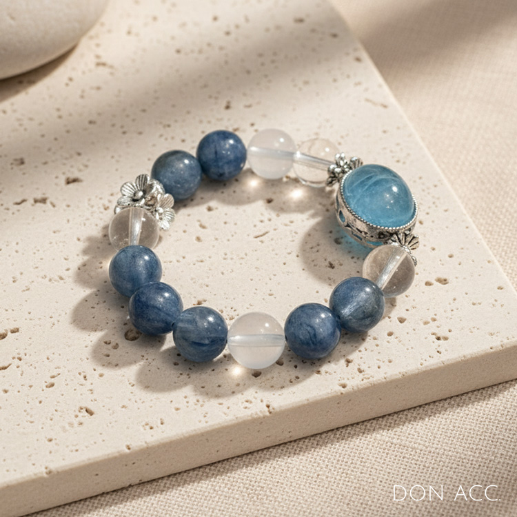 把一天的雜訊輕輕關掉。這款以白水晶 × 白幽靈 × 藍晶石 × 海藍寶組成的能量手鍊,主打「淨化–安定–放鬆」三步驟: