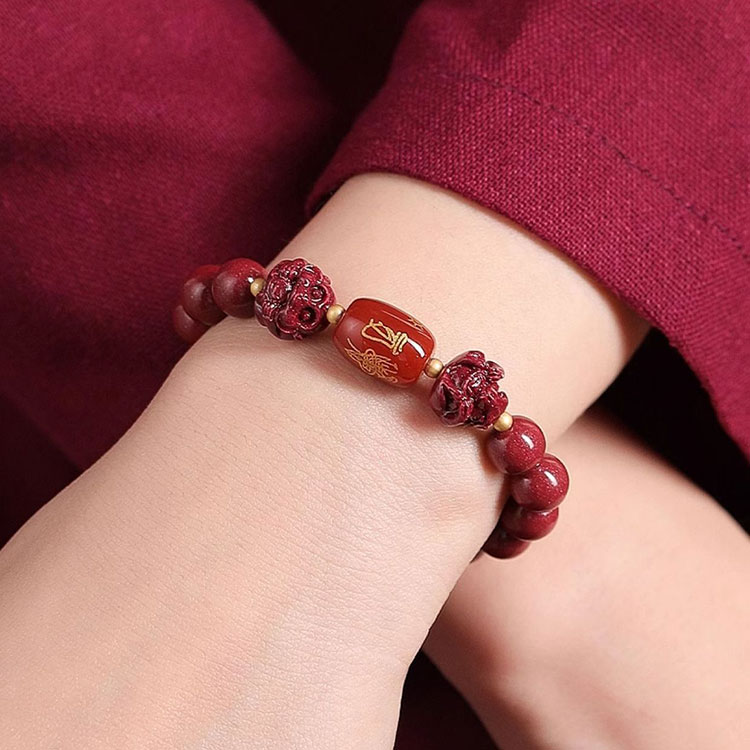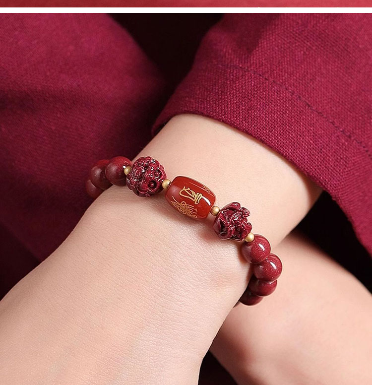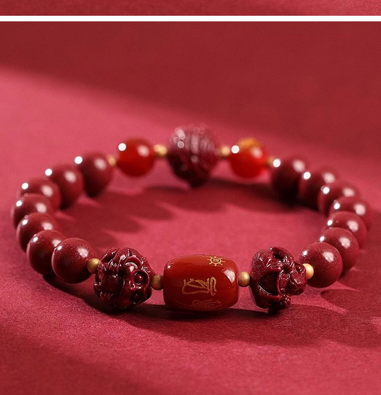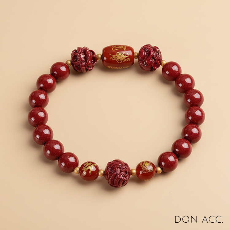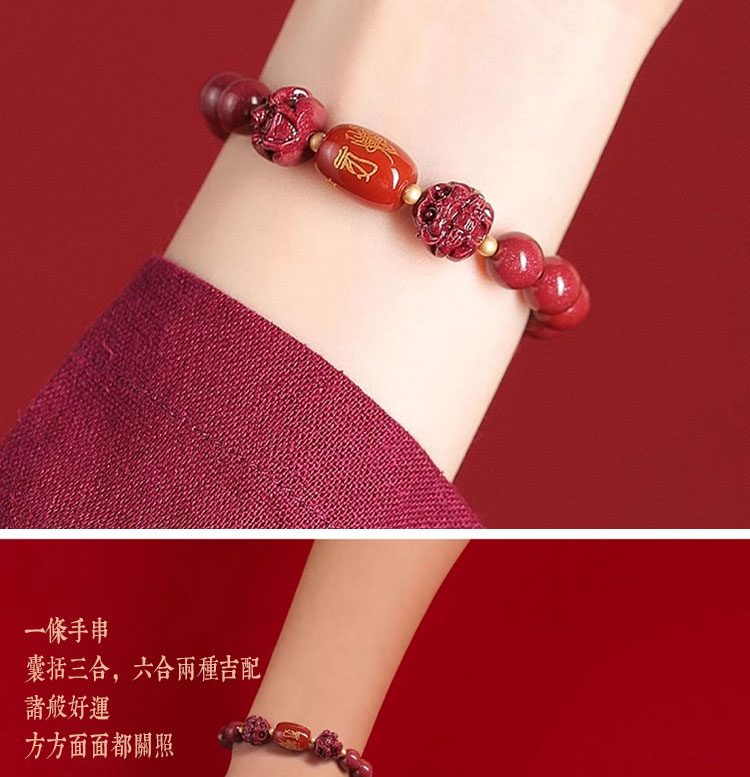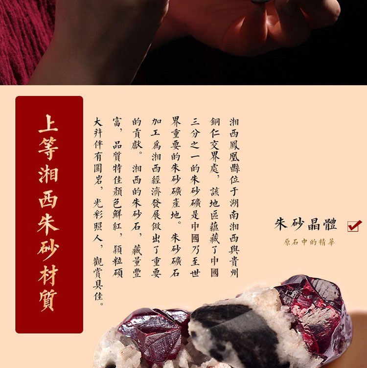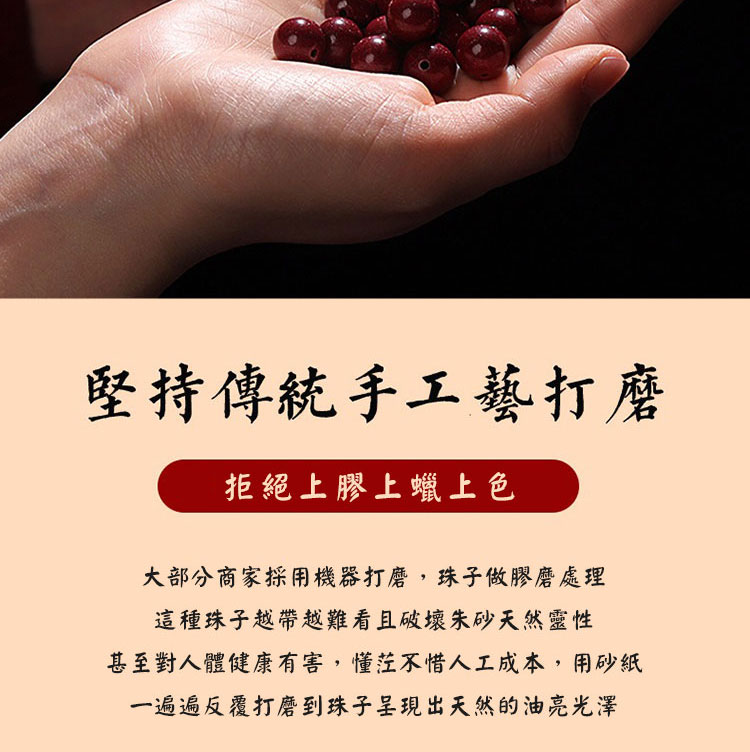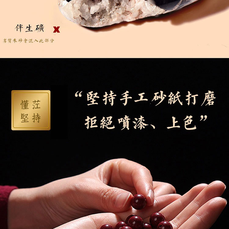 - 保養提醒: 硃砂材質請避免大量碰水、泡溫泉或接觸化學清潔劑,以保持其最佳狀態。
