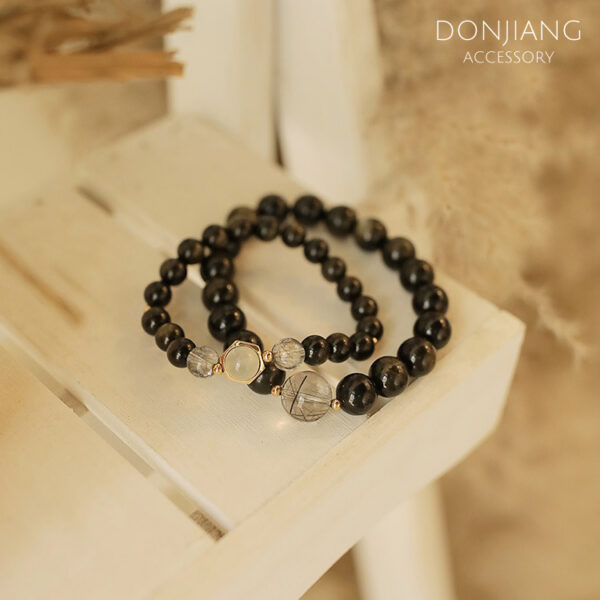 金曜石和黑髮晶,都是超人氣黑色系天然石,皆能驅凶避邪,金曜石能招財、排除負能量、舒緩壓力、穩定身心靈,黑髮晶價格比黑曜石高能提升事業運,又稱為「領袖石」,互相搭配後是一款效果相當全面的手鍊,懂茳設計成情侶款,讓你和另一半能提升彼此,讓關係更加穩定與平衡!